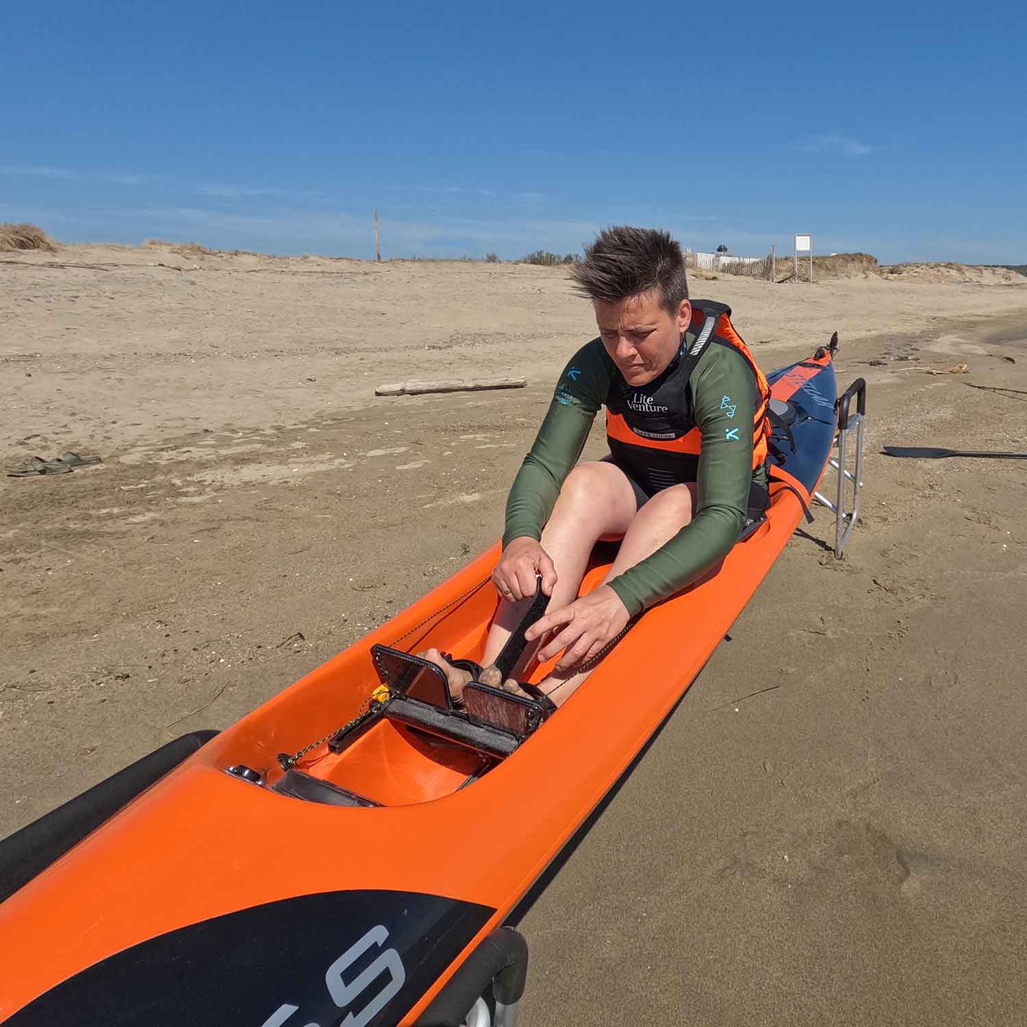 Das Sitzen mit leicht angewinkelten Beinen und geschlossenen Knien kann angenehmer empfunden werden als die „Froschposition“ im klassischen Kajak.