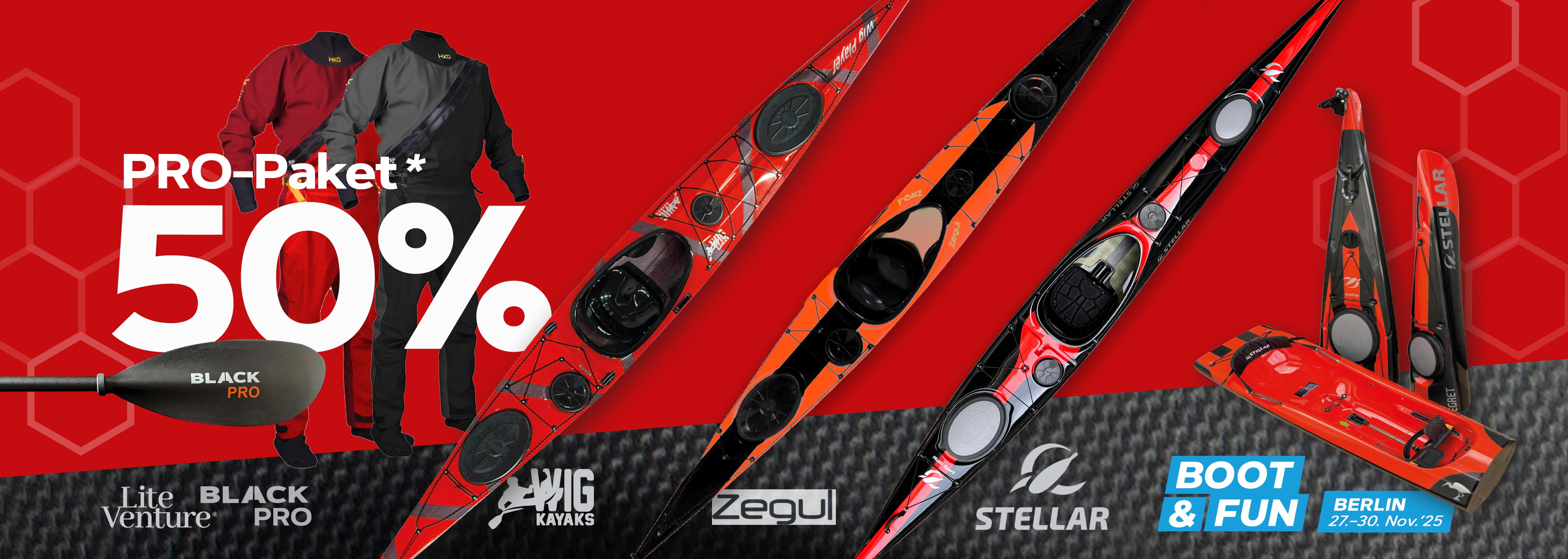⚡️ Pro-Paket: Wähle dein Traumkajak aus einer riesigen Anzahl vorrätiger Kajaks aus oder bestelle eines genau nach deinen Wünschen bis 15. Dezember. Damit kannst du einen HIKO Trockenanzug oder ein BLACK Edition PRO Carbonpaddel für 50% dazu erhalten. Beides ist auch kombinierbar!