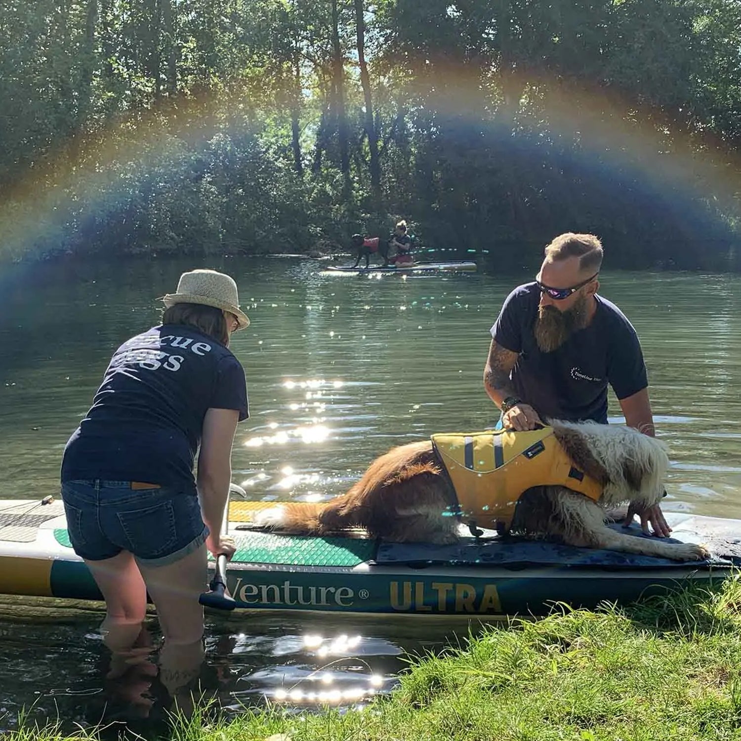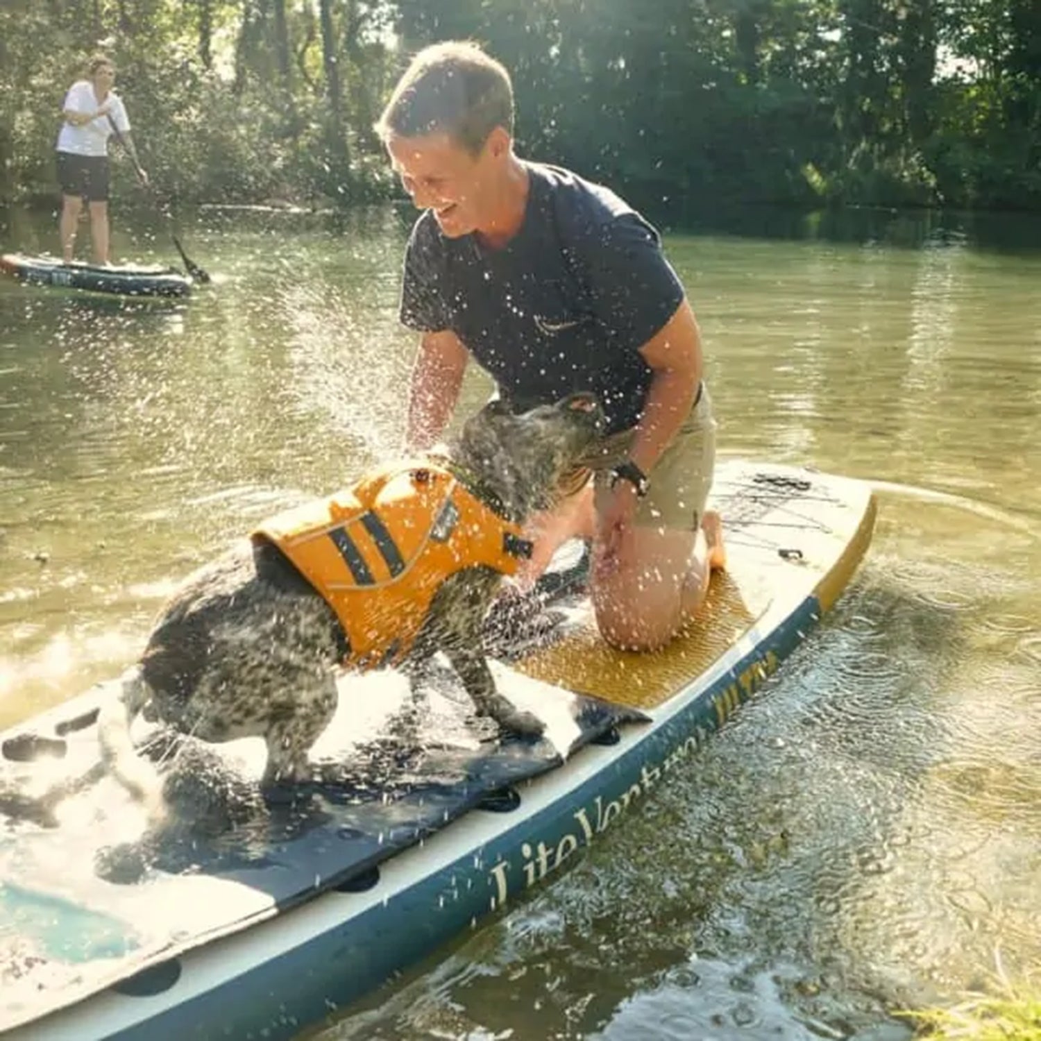Gerd Habel und Isa Federer trainieren ihre Hunde Yago und Amigo auf dem Lite Venture ULTRA 11'6" mit Dog Pad: ein eingespieltes Team.