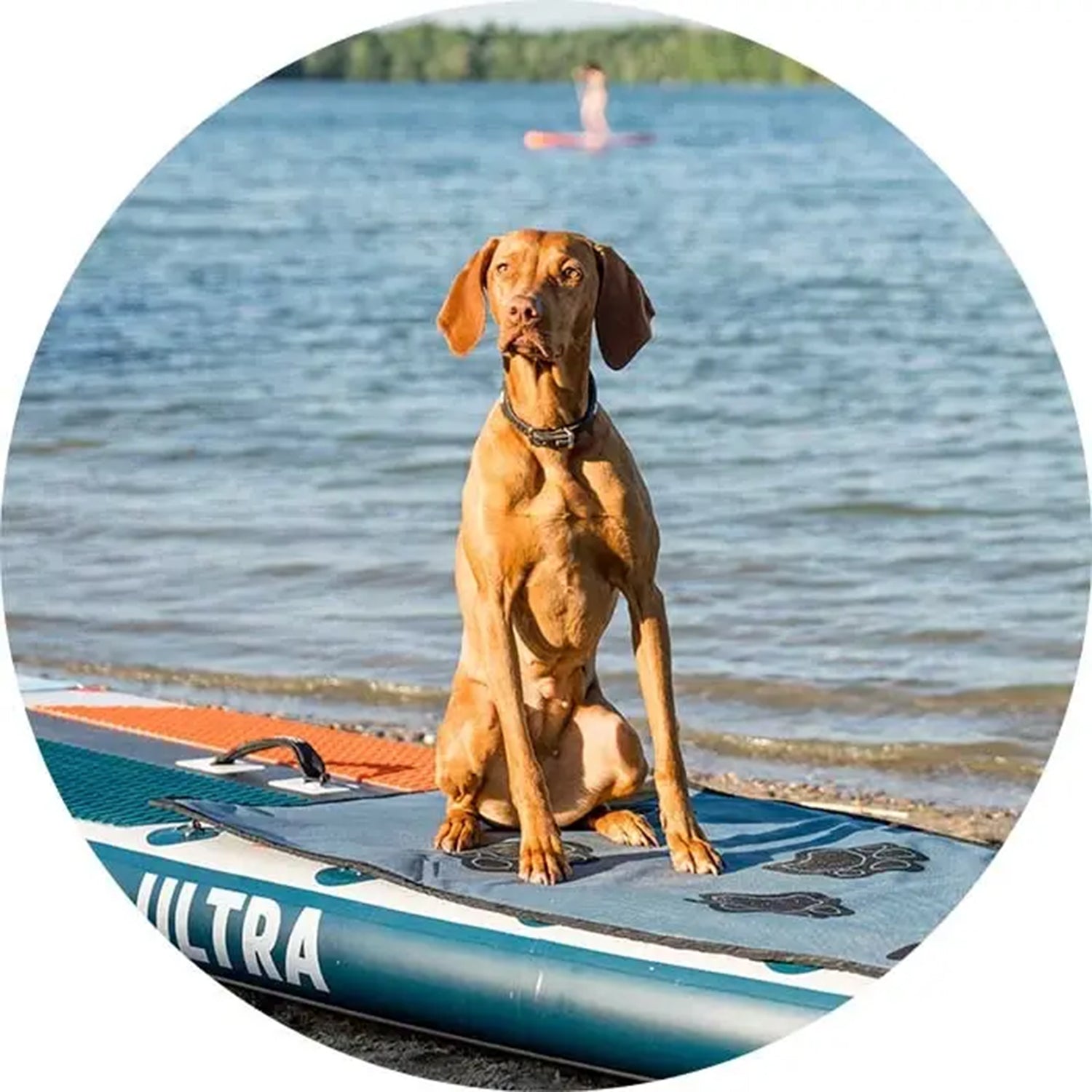 Perfekt abgestimmt ist das Dog Pad auf das Lite Venture Inflatable SUP „ULTRA“: dieses Board hat vorne insgesamt 9 D-Ringe. Das Pad zieht sich von der Spitze bis kurz vor den Bereich der Standflächen. Hier wird das Pad straff an dem Griff gespannt und sitzt insgesamt gut auf dem Board. Das Board selbst ist optimiert als sportliches Touring Board, das schnelle Touren ermöglicht, aber auch bei höherer Zuladung steif und stabil bleibt. Das Board gibt es in zwei Längen 11'6" x 31" und 12'6"x30" - bei beiden Boards passt das Pad vorne optimal drauf und deckt den Bereich des Boards ab, der nicht mit Padmaterial beklebt ist.