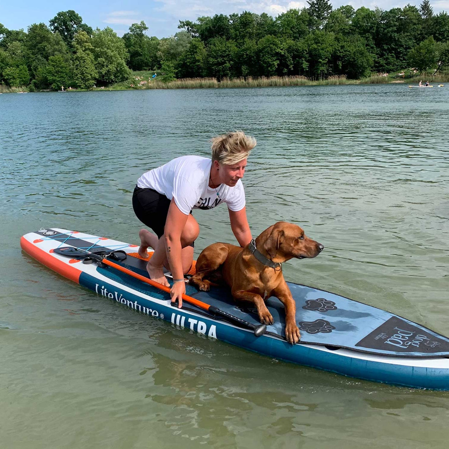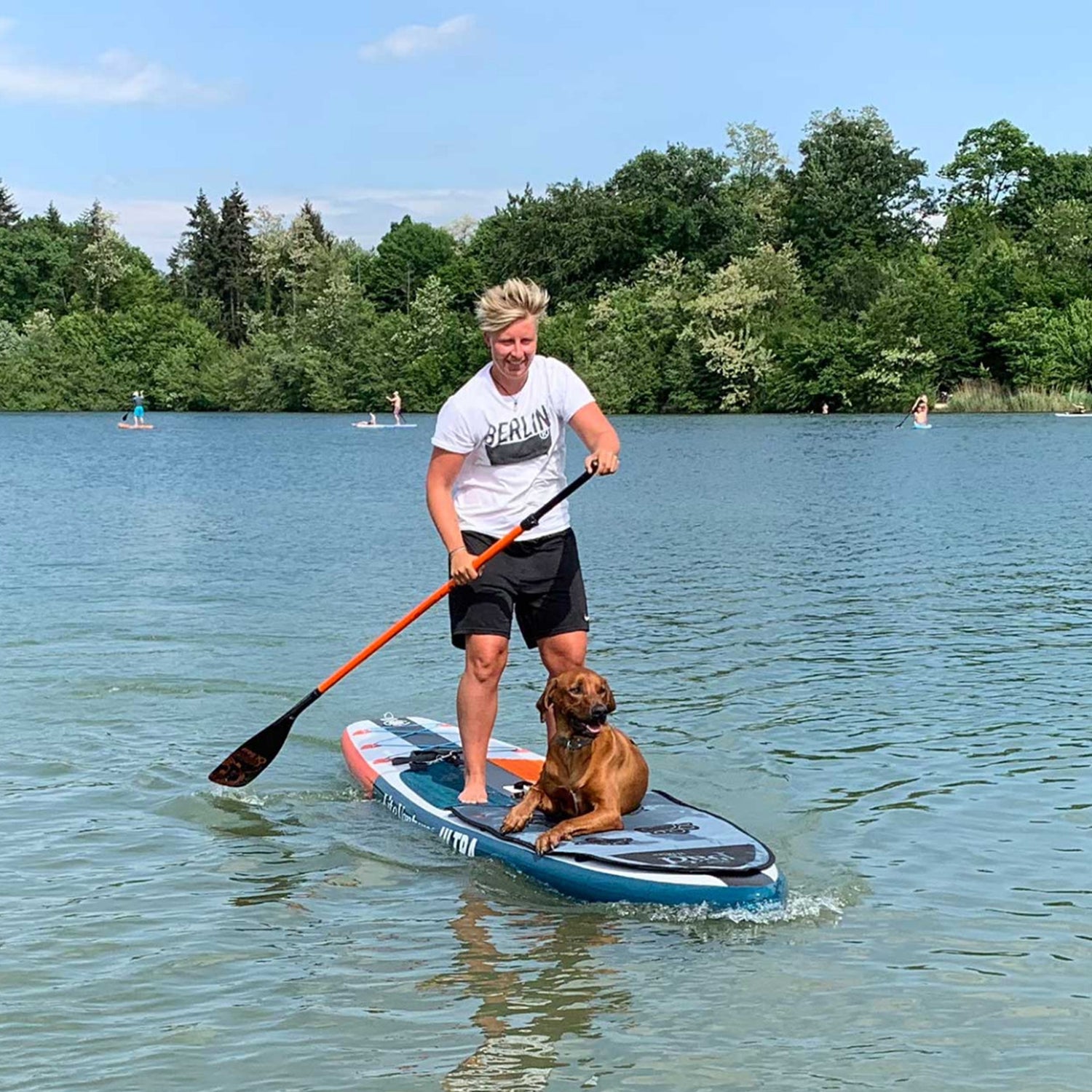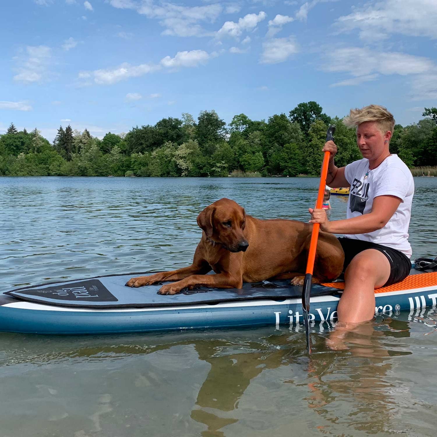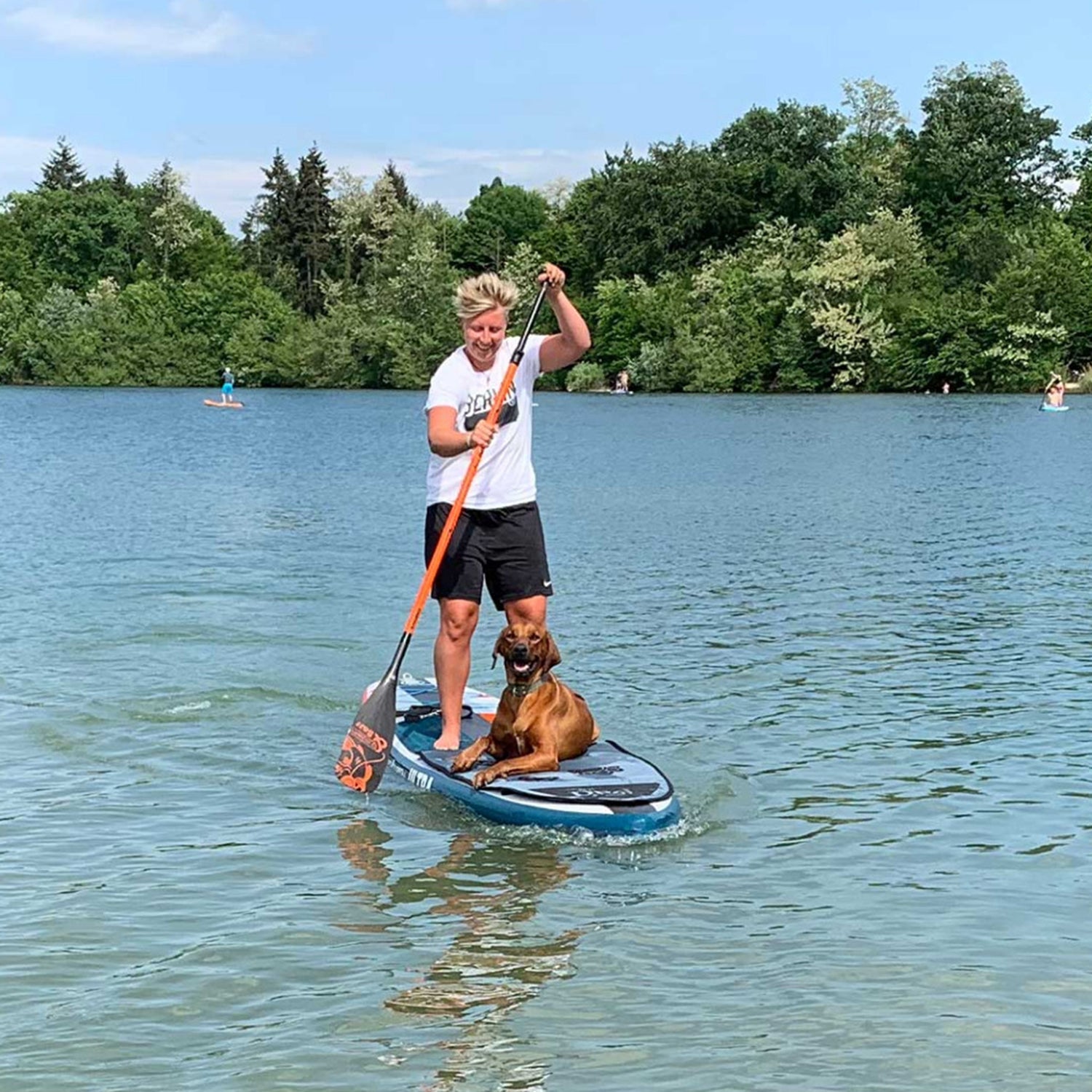 Anne und ich haben keinen Hund. Wir fahren Touren mit dem SUP, schnelle und ausdauernde, auch mit Gepäck. Wir wissen wie es ist, wenn man mit 20 Kilo Zuladung fährt. Wir wissen nicht wie es ist, wenn sich diese Zuladung plötzlich bewegt, vom Board springt, von vorne nach hinten läuft, zwischen den eigenen Beinen durch und wieder zurück ...