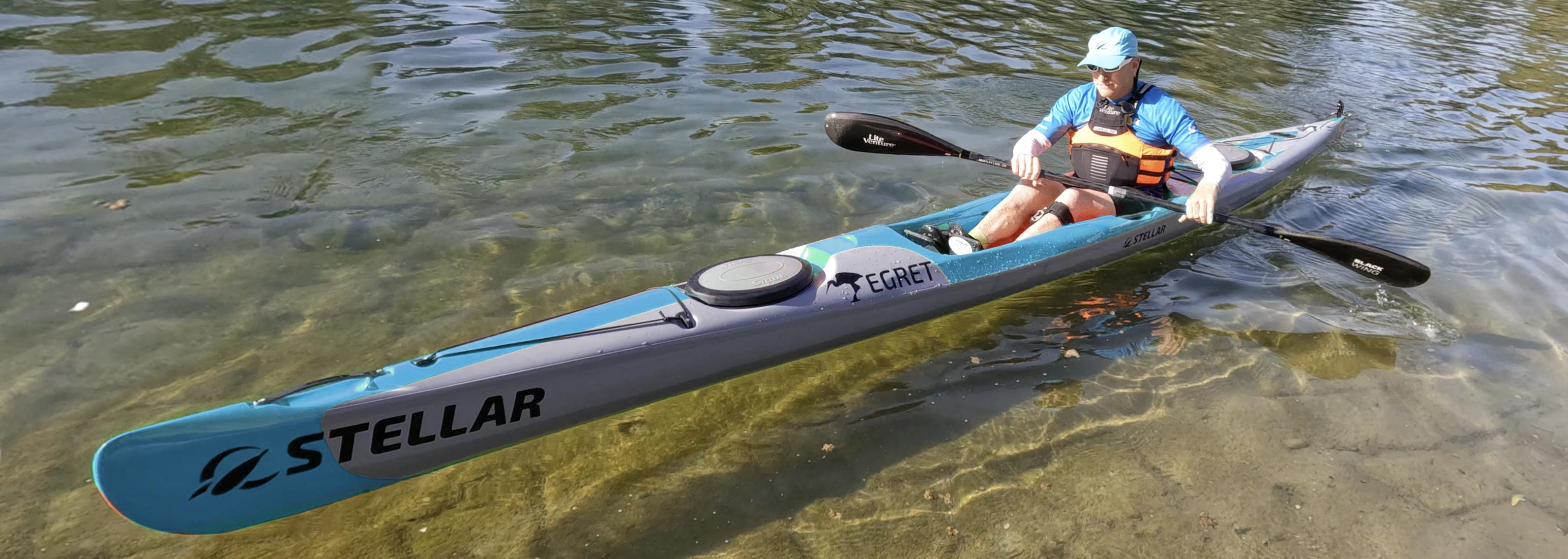 The Stellar Egret has a boat concept that combines the advantages of a surf ski with those of a touring kayak: the open seating allows different seating positions and quick entry and exit. The luggage hatches make it possible to carry luggage for tours lasting several weeks.