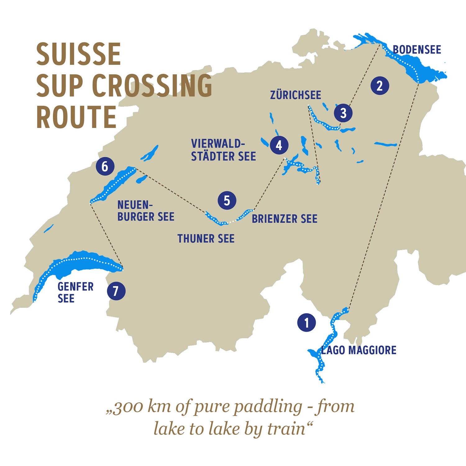Cela signifie une moyenne de 40 kilomètres par jour sur des lacs, qui, selon la météo, peuvent aussi offrir des conditions assez difficiles avec beaucoup de vent et de vagues. Le parcours terrestre d’une mer à l’autre doit être parcouru sans voiture. Ivan a donc dû passer de son Sunova Raceboard habituel (un panneau dur, bien sûr) à un SUP gonflable, qui peut également être facilement transporté dans le train et sur le trajet entre la rive et la gare.