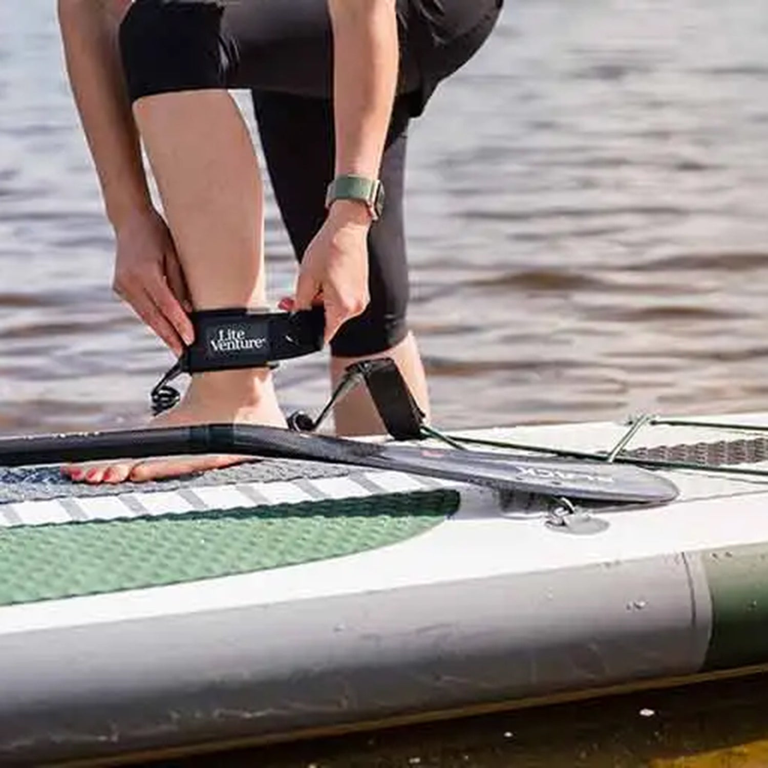 Photo ci-dessus : Le leash (= line) est attaché à la cheville et à la planche avec du velcro. Il sécurise la planche et l'empêche de dériver après une chute à l'eau. Lorsque l'on pagaye sur eau plate, une « laisse enroulée » est utilisée car elle s'enroule et se resserrentsi nécessaire. De cette façon, vous ne vous emmêlerez pas. Les laisses « enroulées » sont lisses et s’utilisent lors du surf. Le leash doit être attaché à un anneau en D à l'arrière de la planche, et non au filet à bagages.