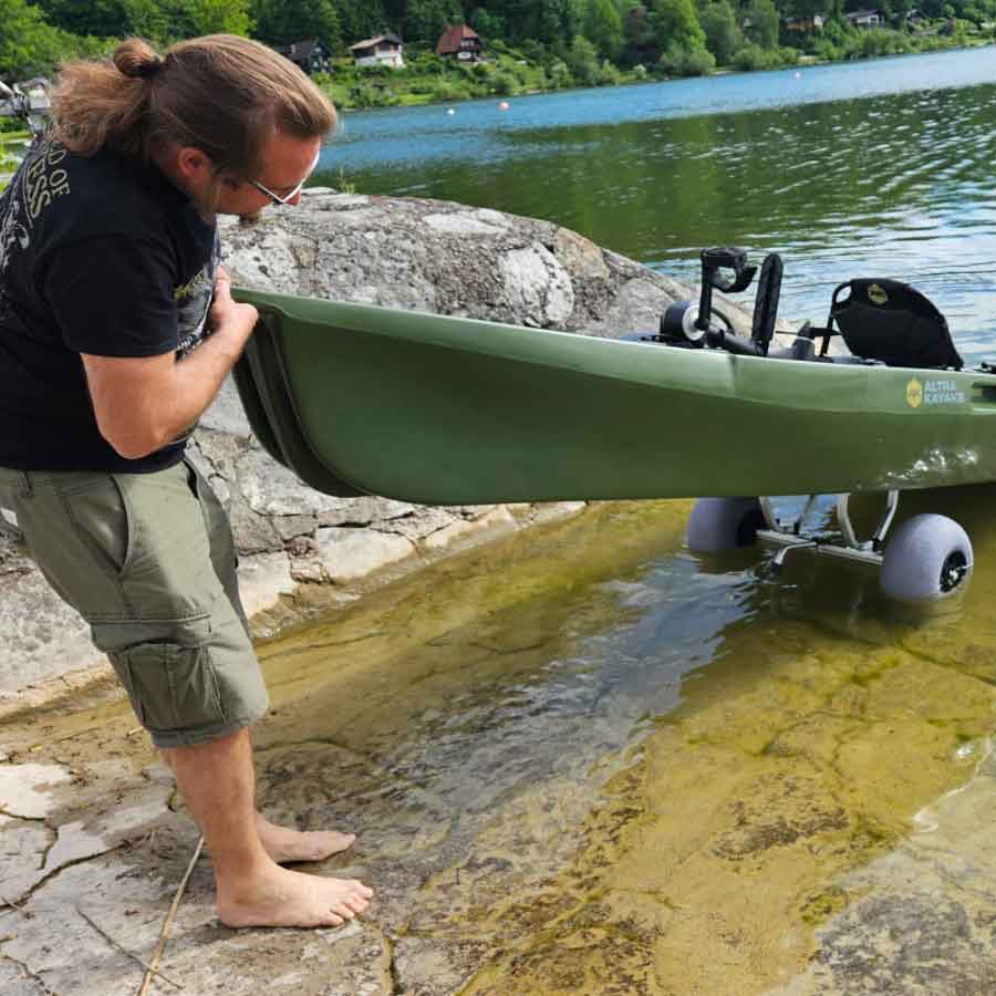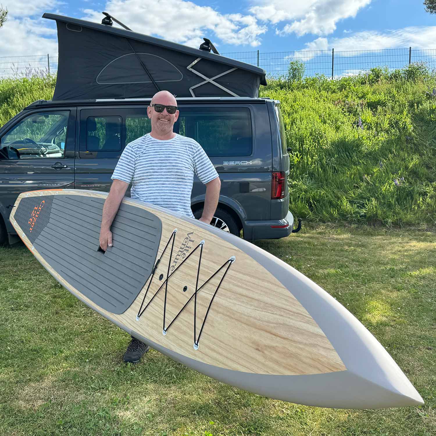Rico gère le Bulligarage à Halle et réunit les passions VW Bus & sports nautiques avec les planches SUP Lite Venture, les kayaks de pêche Altra et une petite sélection de kayaks de randonnée Stellar.