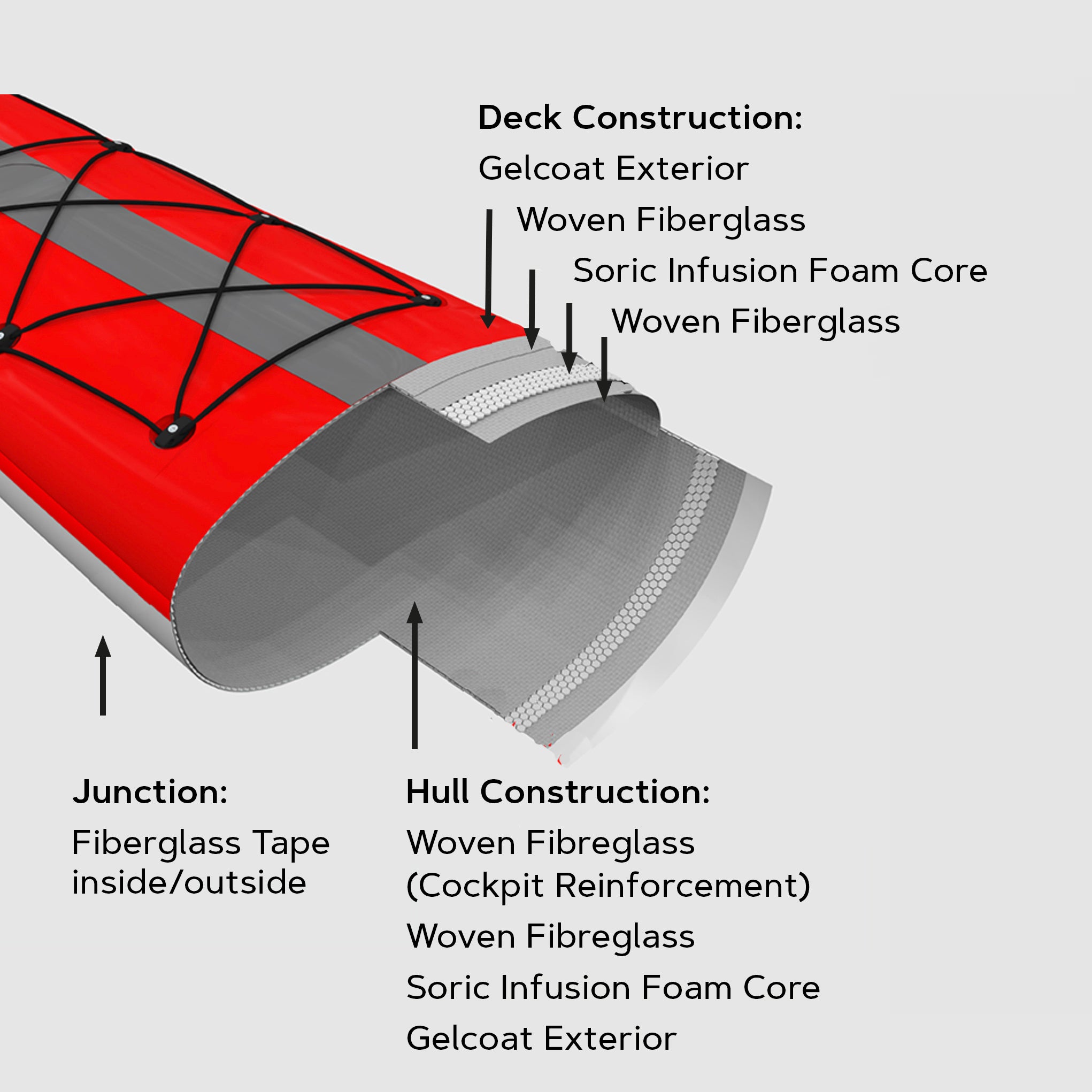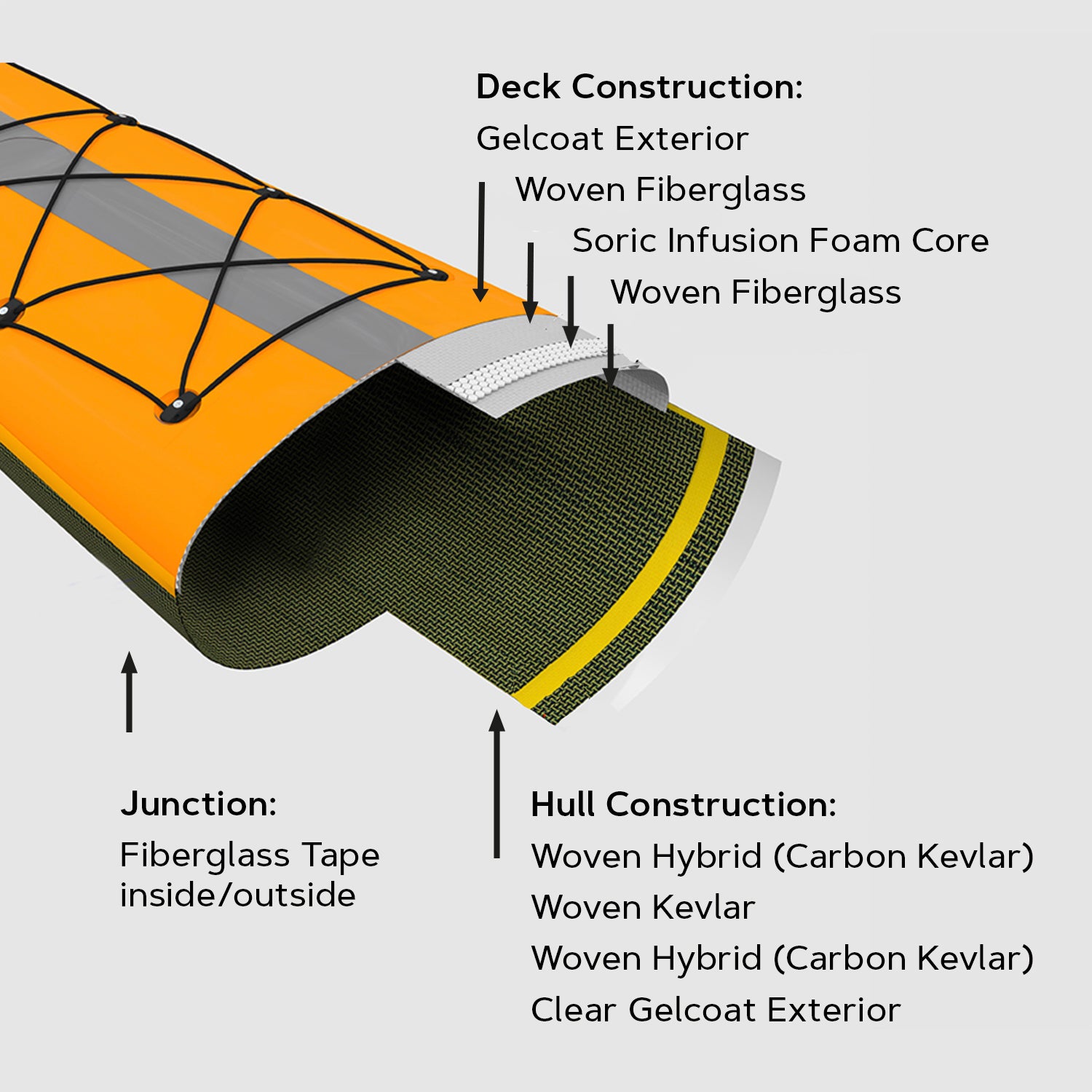 Dans le Multisport Layup, l'arc complet est en Carbone Kevlar. La finition est un gelcoat transparent. Le pont présente la disposition de la série Advantage. La construction en Carbone Kevlar est très durable. En termes de poids, le résultat est un kayak très léger mais robuste pour cette catégorie de poids. Les kayaks multisports sont généralement aussi légers que les kayaks Advantage.