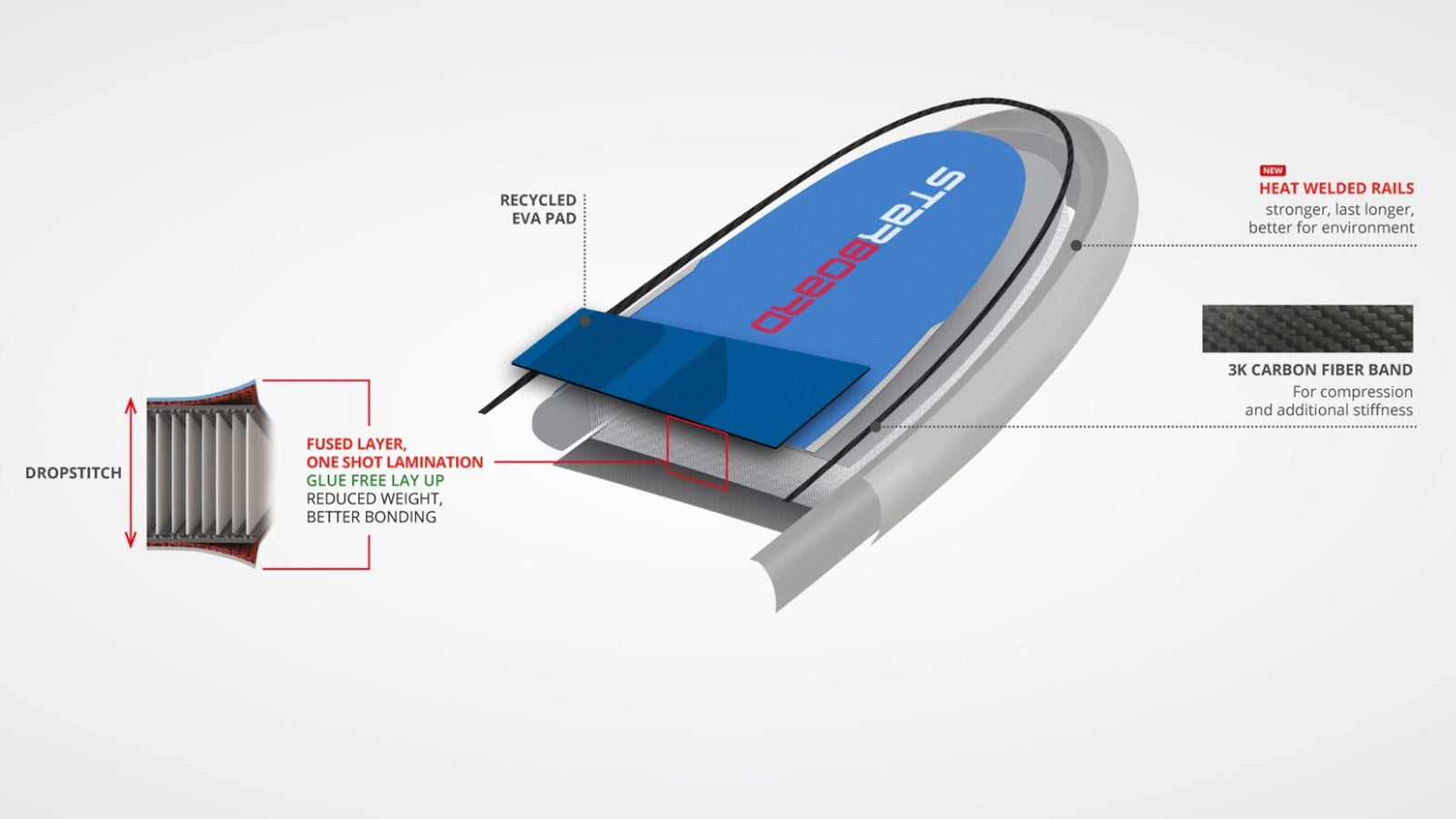 Affinché una tavola sia remabile, deve essere rigida e supportare il/i rider. Inoltre, non deve diventare rotondo come la camera d'aria di una bicicletta quando la si gonfia. Per capire come ciò sia possibile, diamo un'occhiata all'interno di un iSUP: