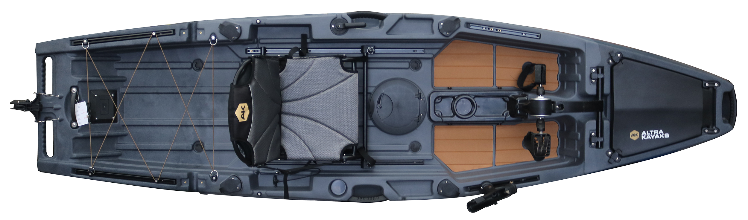 Alle Angelkajaks mit Pedalantrieb verfügen über ein Heckruder. Dieses wird über einen Bedienhebel neben dem Sitz gesteuert.