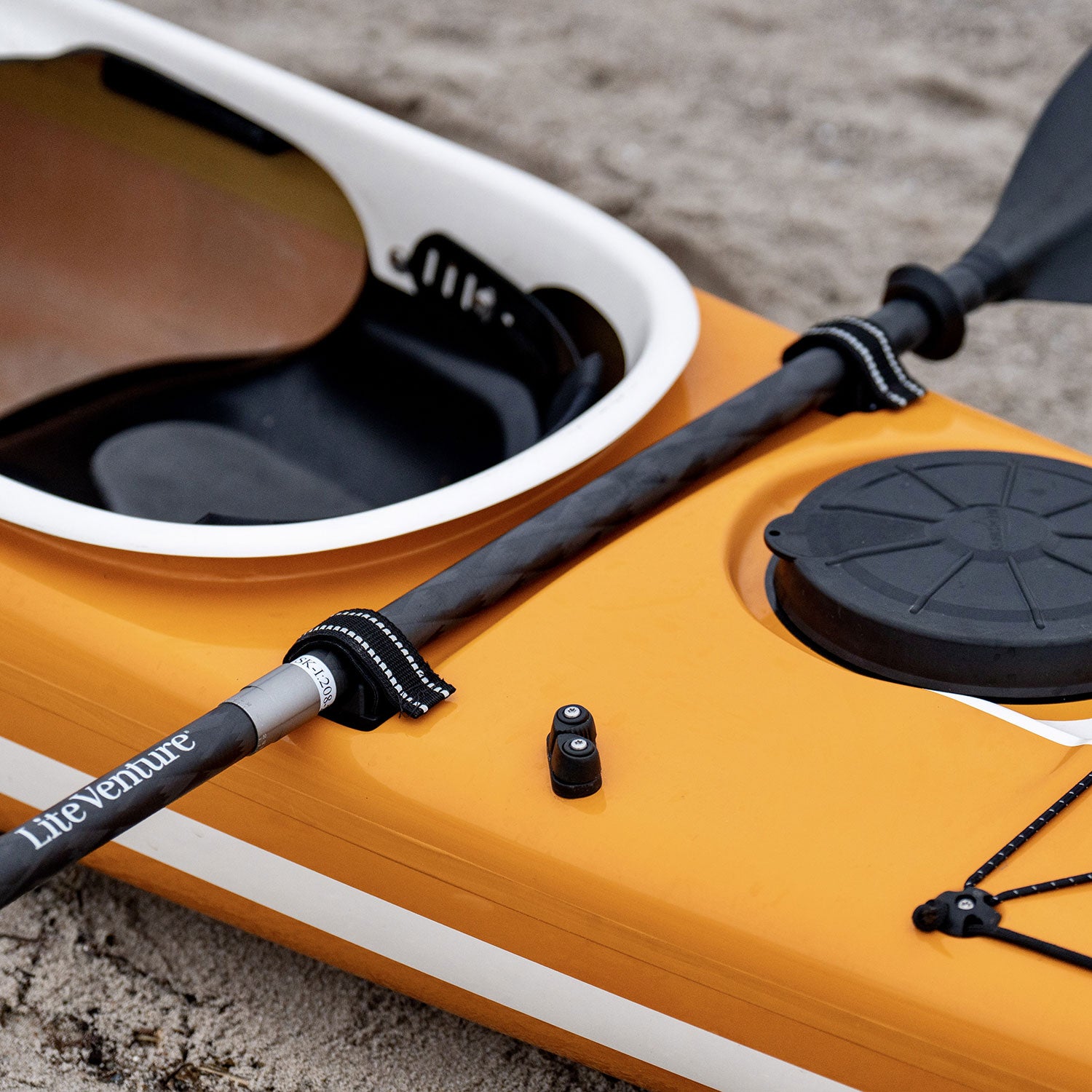 Hinter dem Deck befindet sich die Vorrichtung, um das Paddel bei der Stütze sicher in der Mitte des Kajaks zu fixieren. Das hilft beim Solo-Wiedereinstieg.