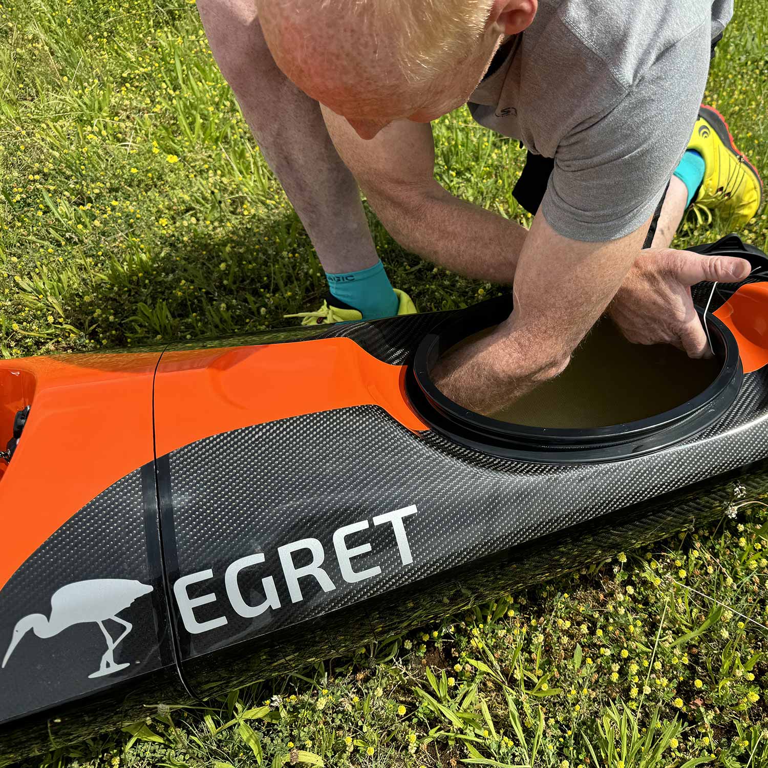 Das Alpha Layup ist sehr leicht und steif. Hier ist ein Design mit Sicht-Carbon möglich. Es ist nur verfügbar für Sit on Tops und Surfski. Das Bild zeigt das modulare Sit on Top „Egret“ im Alpha Layup.