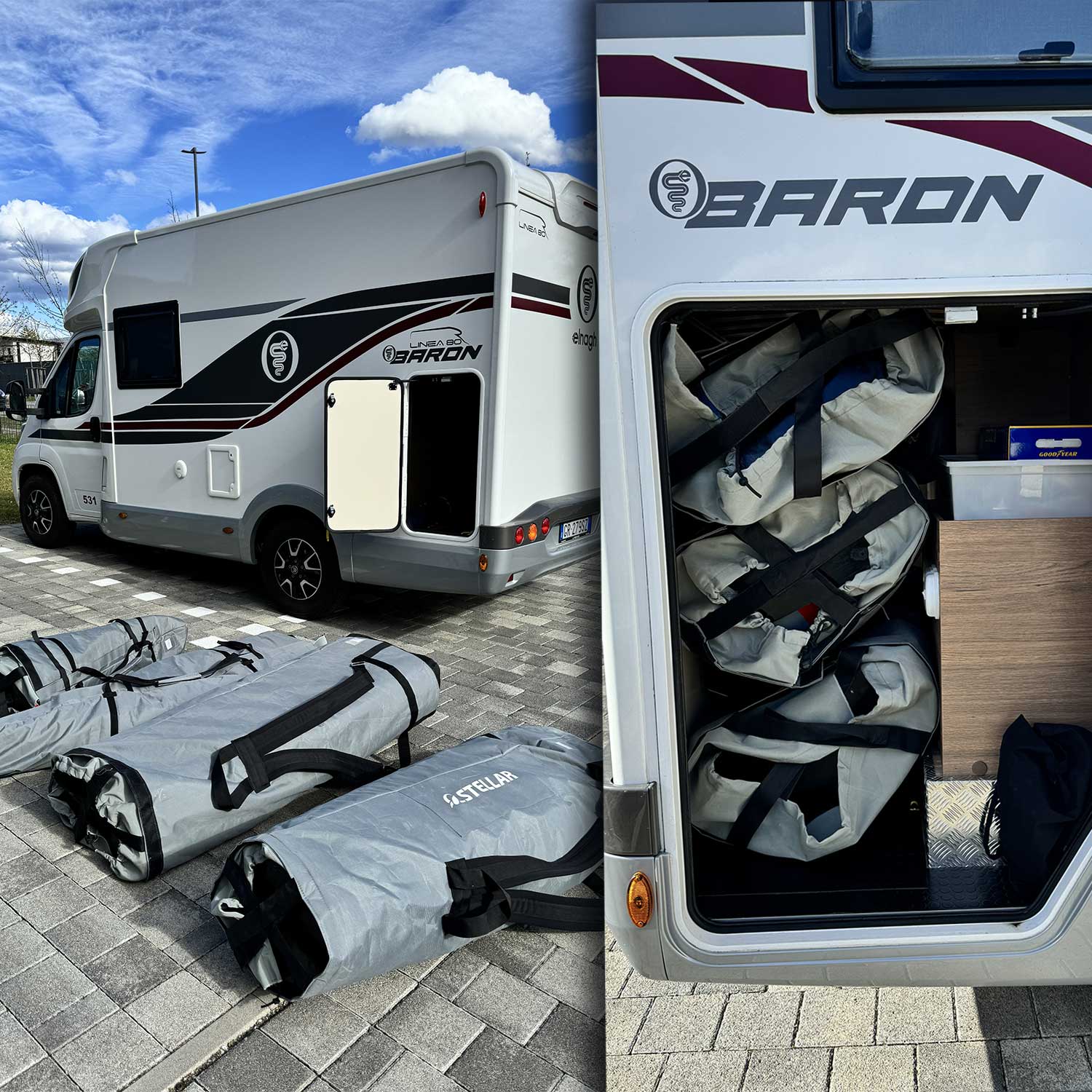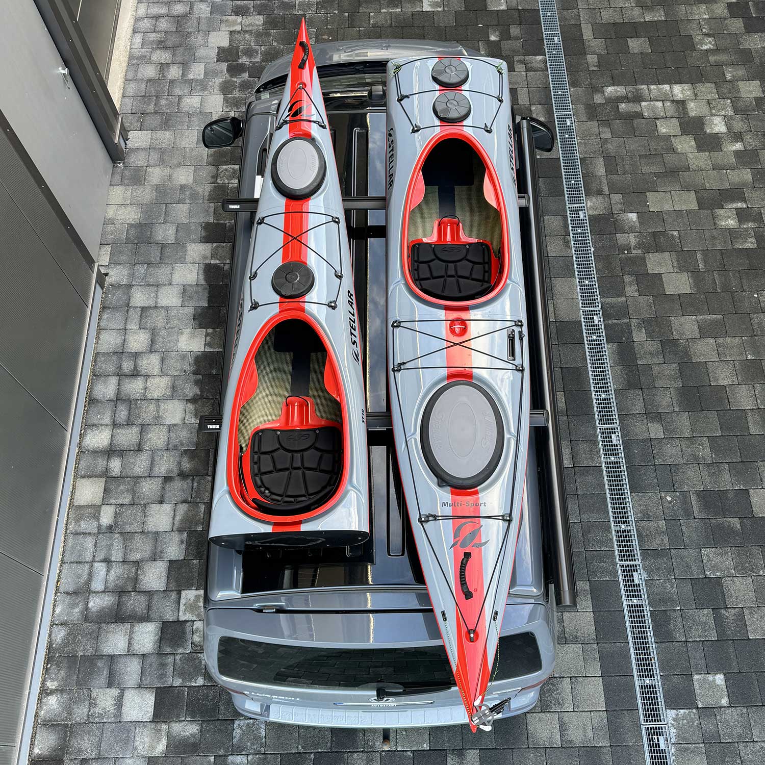 Ideal für den kompakten Transport in der (durchgehenden) Heckgarage eines Wohnmobils - nie wieder mit dem Kajak auf‘s Dach müssen!