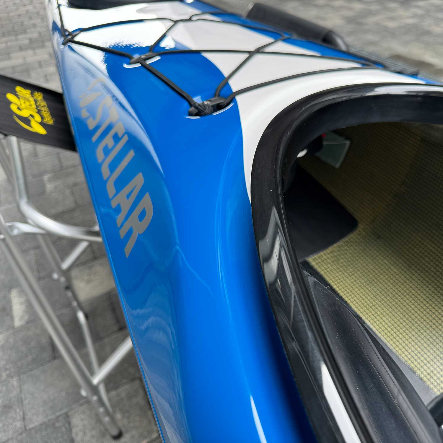 Aus der Serie der Touring Kajaks von Stellar stehen zwei besonders schnelle Tourer besonders hervor: der einer S18R sowie der Stellar Tandem ST21. Hier spürt man die Renngene der Stellar Kajaks bei jedem Paddelschlag. Sowohl S18R als auch ST21 Tandem sind mit QR Touring Footbrace ausgestattet (s. Bild unten rechts).