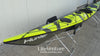 Hier in der robusten Ausführung im Carbon/Kevlar Layup, Kielstreifen, Skeg und Deck in Signalfarbe „Acid Green“. Das Carbon/Kevlar Gewebe hat die Stärke 210 g/qm² und ist über das gesamte Unterschiff sichtbar. Kielstreifen, Nahtband, Sitz und Süllrand sind schwarz.